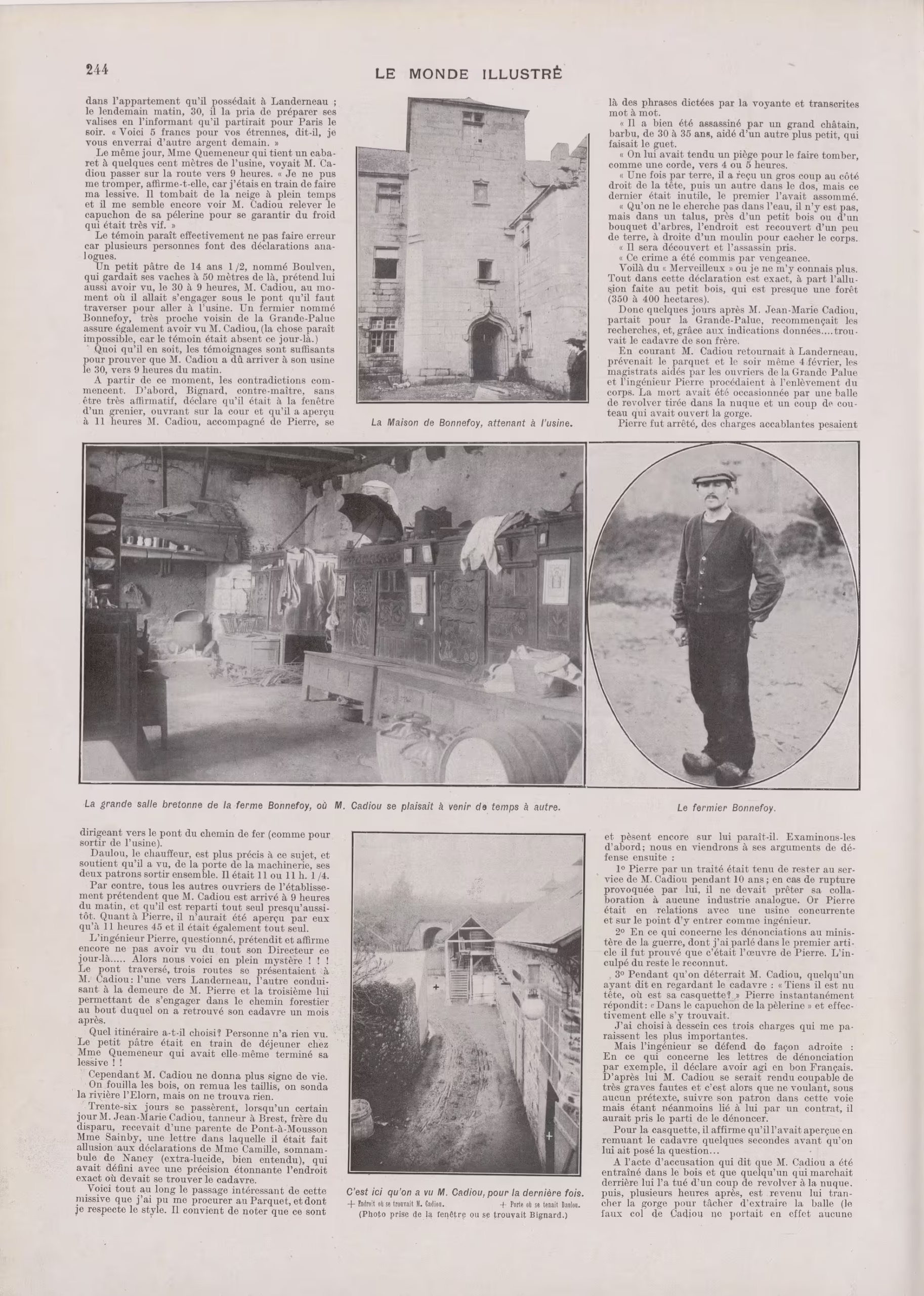 Envoyé spécialement par Le Monde Illustré, je suis allé tout là-bas, au fond du Finistère, pour documenter nos lecteurs. J’ai vécu pendant huit jours dans le cadre même de l’ « Affaire », interrogeant les témoins (dont beaucoup se contredisent), étudiant de mon mieux les versions déjà données, prenant note des déclarations nouvelles, etc…, etc…